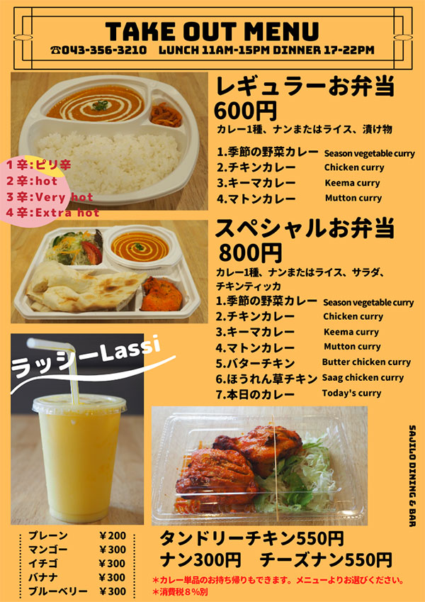 稲毛区山王町のSajilo Dining & Bar(サジロダイニング&バー)お手頃価格のカレー弁当がテイクアウト可能!